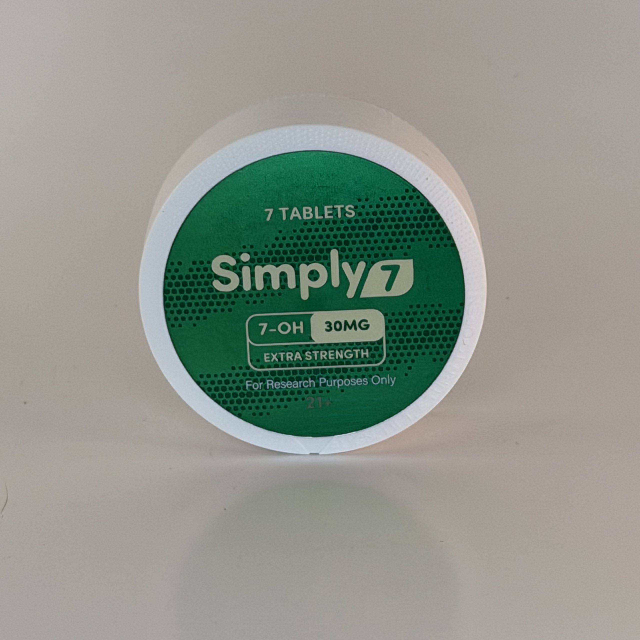 Simply 7 Extra Strength 7‑OH Tablets in Lemon Mint come in a 7‑count pack totaling 210mg. Each tablet is uniformly pressed and easy to handle, providing a straightforward, clearly portioned format for customers who prefer small to mid‑count options.